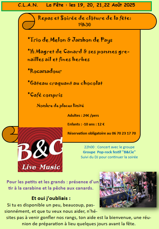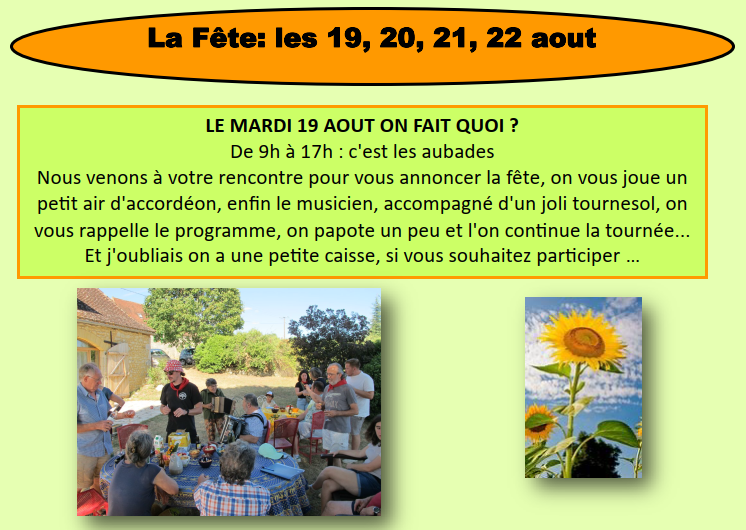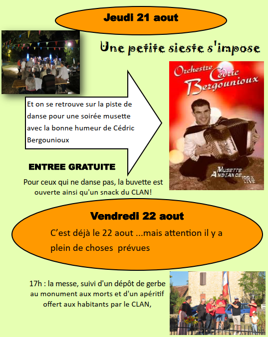 – Vendredi 22 août : Messe à 17h, suivi d’un dépôt de gerbe au monument aux morts, et d’un apéritif pour les habitants par le CLAN. Repas de clôture à 19h30.