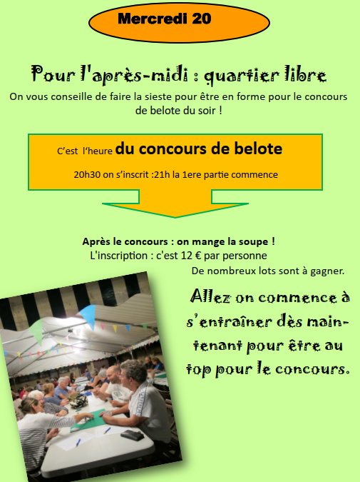 – Mercredi 20 août : Concours de belote, inscriptions à partir de 20h30, parties à partir de 21h