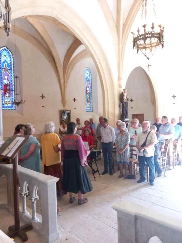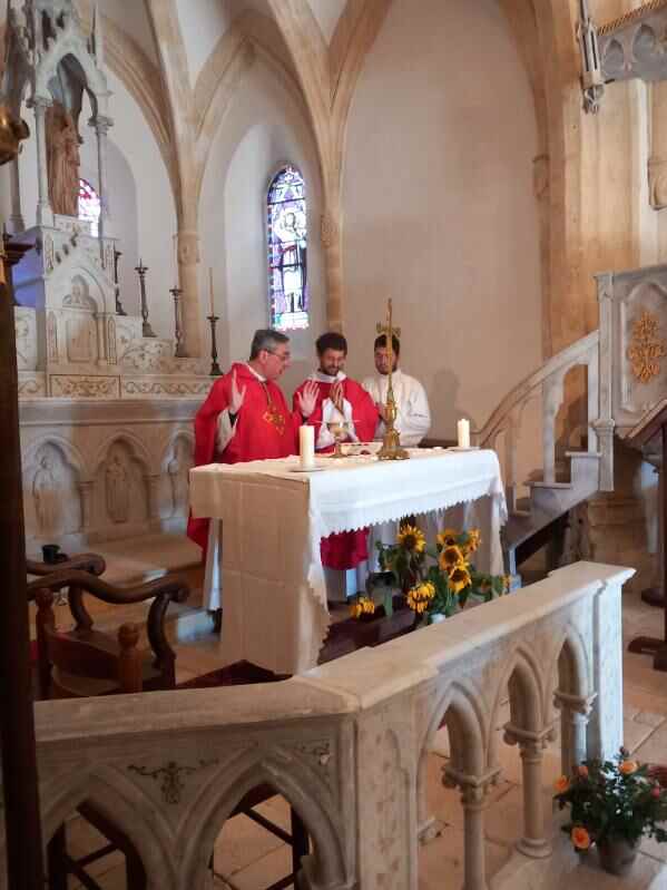Très belle célébration avec une messe chantée et célébrée par notre Évêque Mgr Laurent Camiade et Père David Réveillac pour la bénédiction de l’église. Retable et chemin de croix restaurés, à l’église Saint-Pierre-es-Liens de Nadaillac de Rouge, le 9 août 2024.