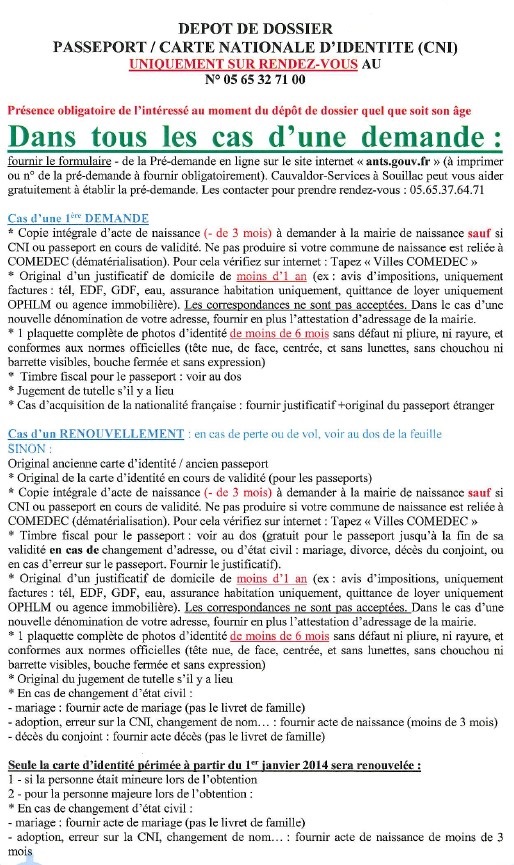 Un changement important concerne la création et le renouvellement des pièces d’identité et papiers officiels. Il faut maintenant faire une « pré demande » en ligne, puis tout se fait à Souillac. Tout est expliqué ci-dessous.